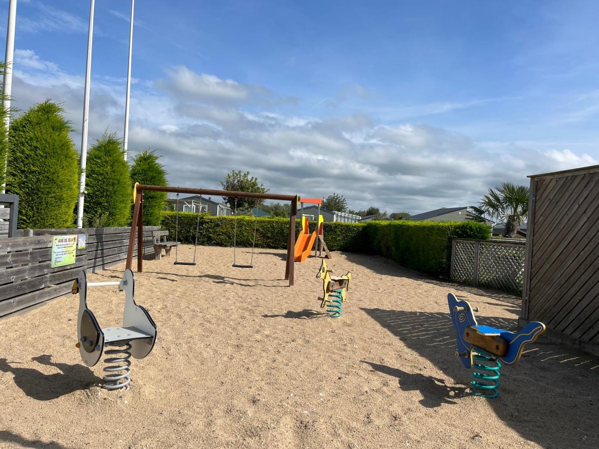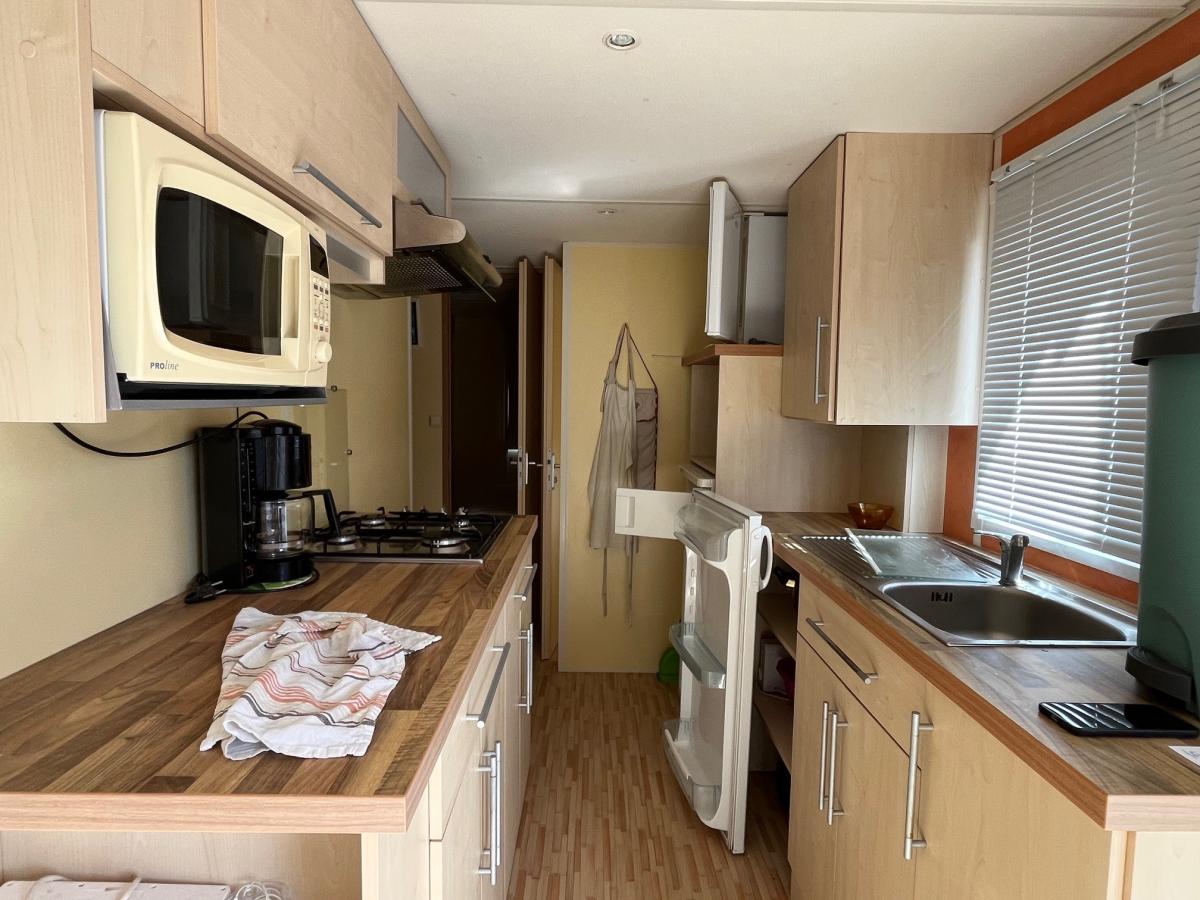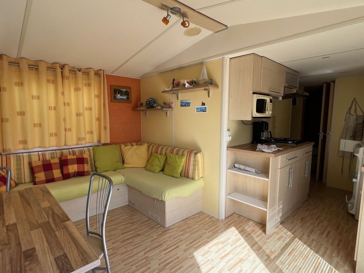 Dans un camping **** avec piscine, situé à environ 100 m de la plage, un terrain de 170 m² sur lequel vous trouverez un mobil-home comprenant :